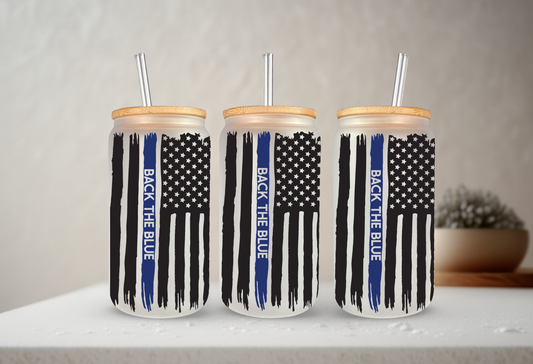 Back The Blue | UVDTF | 20 oz Libbey Can Glass with Bamboo Lid & Straw