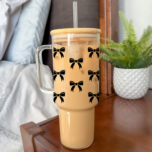 Black Check Coquette | UVDTF | 40 oz Glass Tumbler with Bamboo Lid & Straw