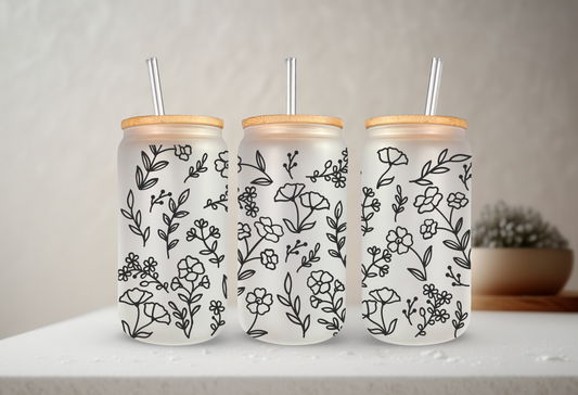Boho Floral Line Art | UVDTF | 20 oz Libbey Can Glass with Bamboo Lid & Straw