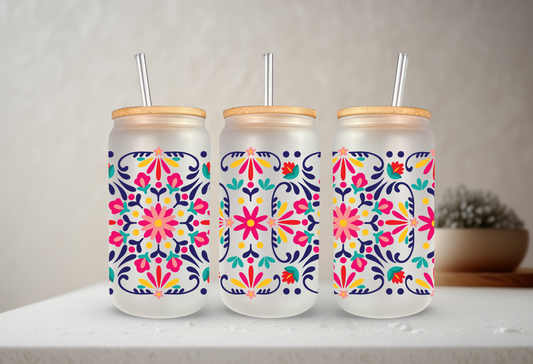 Mexican Floral | UVDTF | 20 oz Libbey Can Glass with Bamboo Lid & Straw