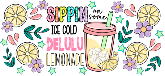 Sippin on Some Ice Cold Delulu Lemonade | UVDTF | 15oz Mug with Handle, Bamboo Lid & Straw