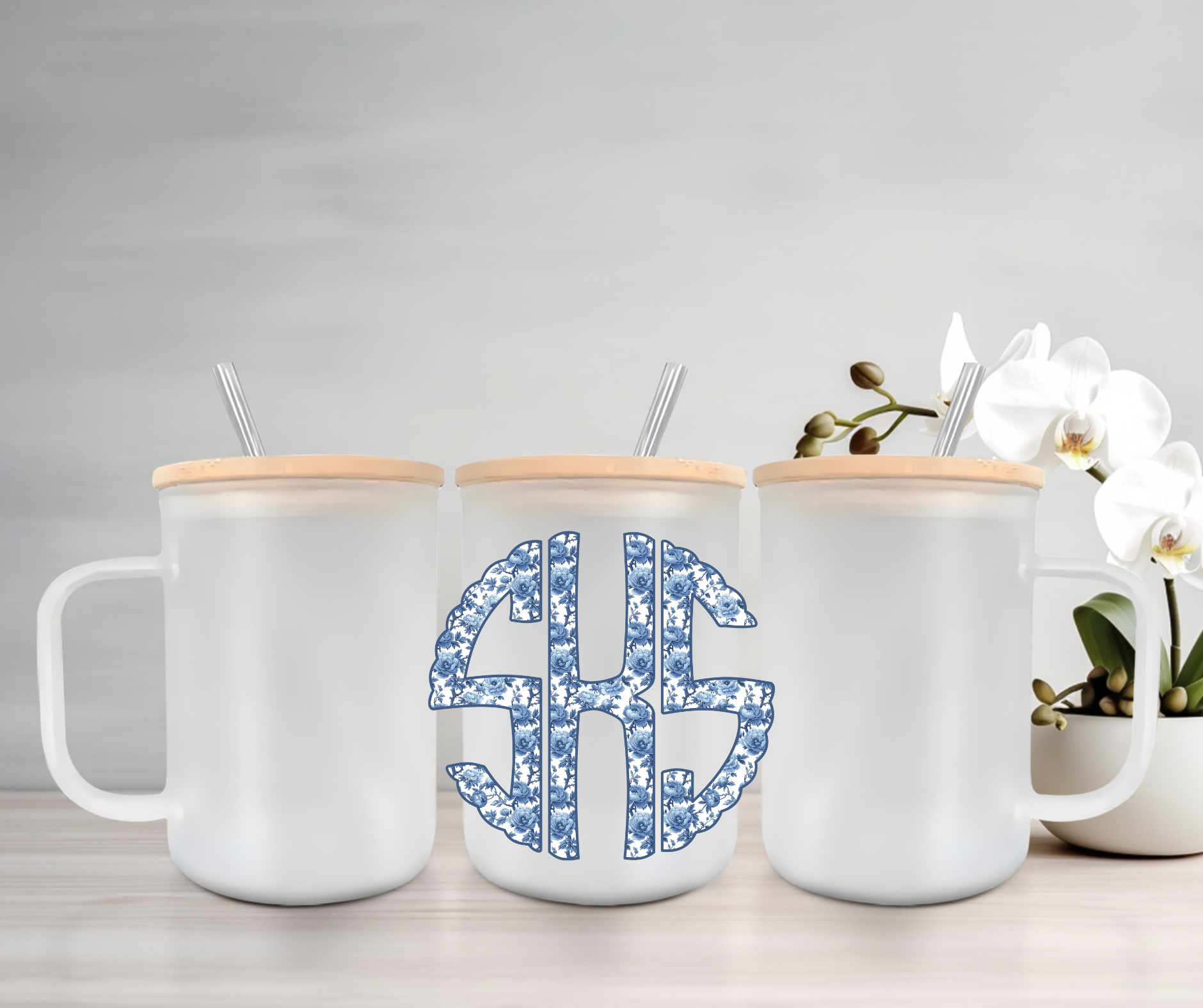Blue Chinoiserie Monogram | UVDTF | 15oz Mug with Handle, Bamboo Lid & Straw