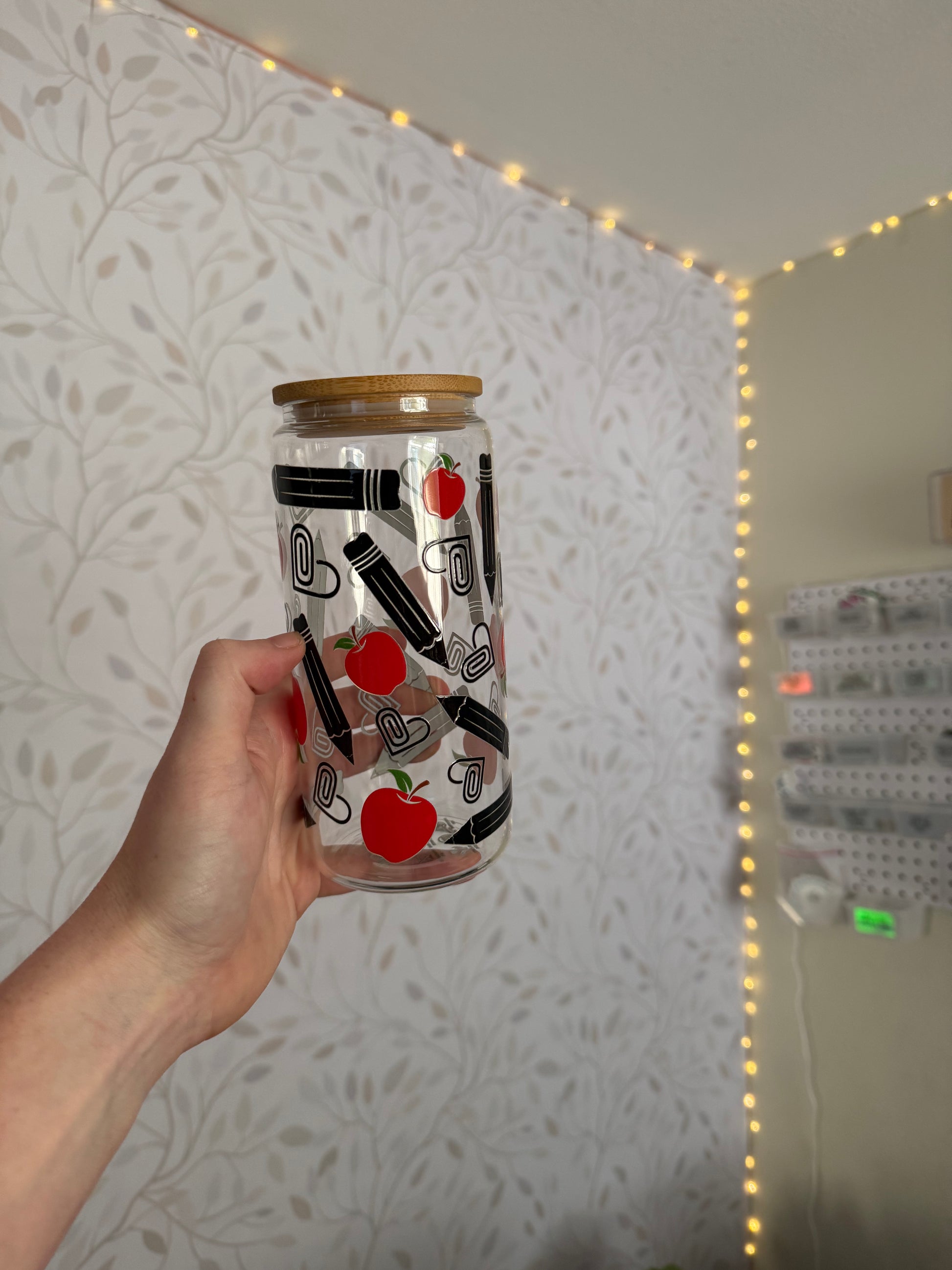 Teacher Apples & Pencils | UVDTF | 20 oz Libbey Can Glass with Bamboo Lid & Straw